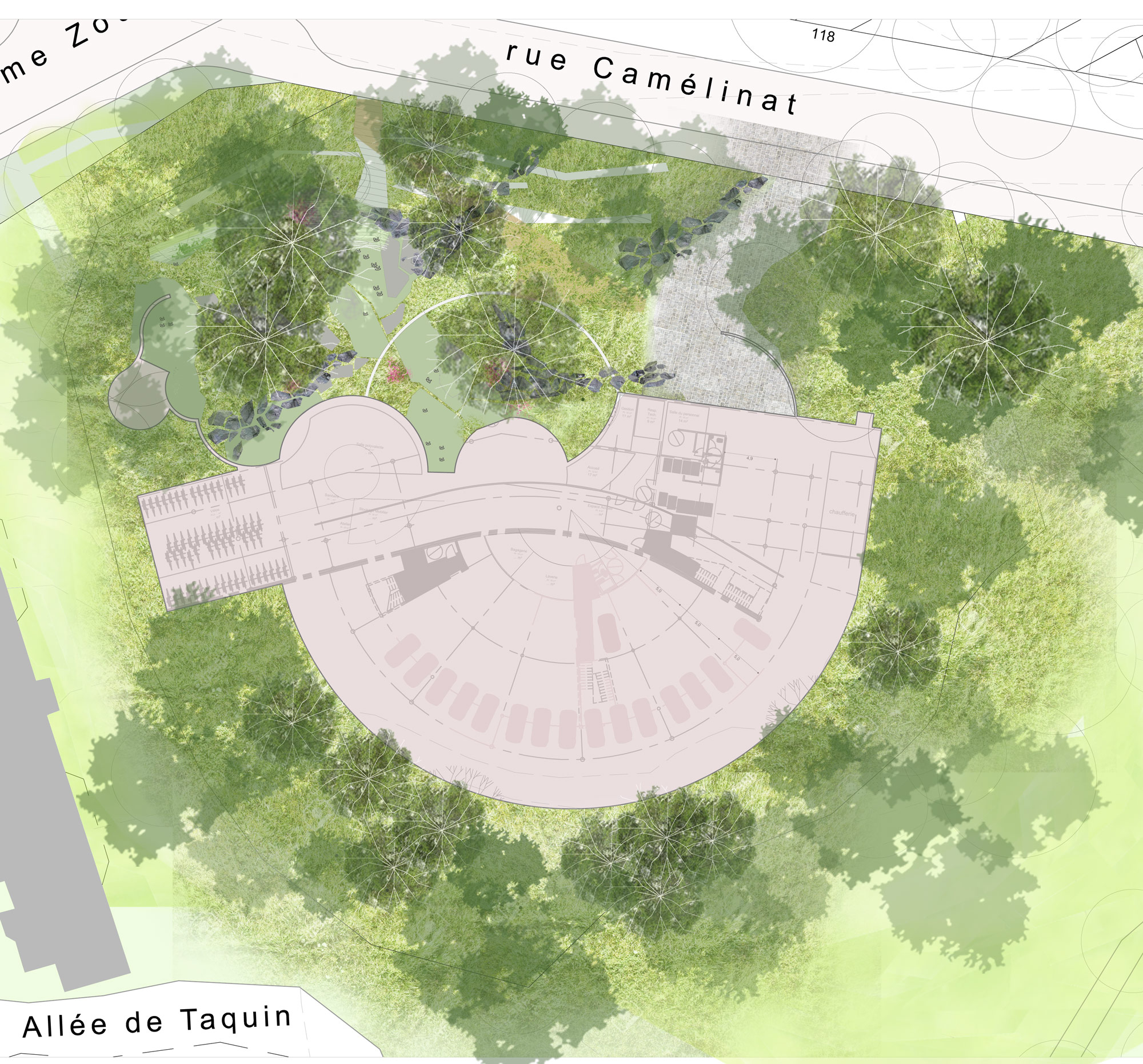 Le projet propose de retrouver un sol perméable, définir des espaces de jardin où les graines se ressèment pour fabriquer un petit paysage et accompagner les moments de repos des habitants. Nous reconstituons un sol fertile pour se repositionner à l’échelle de la géographie. Des empierrements posés dans le jardin permettent de circuler, de s’installer au soleil. Une clairière fleurie permettra aux habitants de cultiver des légumes et des petits fruits.