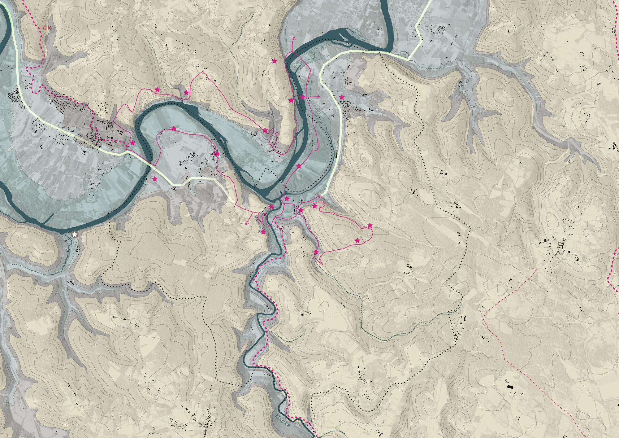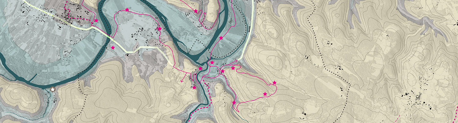 Par l’intermédiaire d’arpentages collectifs, d’ateliers de travail collaboratifs, l'équipe de maitrise d’œuvre et les acteurs locaux retrouvent la figure originelle et locale de la commune. Cette figure s’appuie sur les tracés topographiques existants, qui constituent la singularité de Lacave. S'appuyer sur 3 terrasses géologiques :