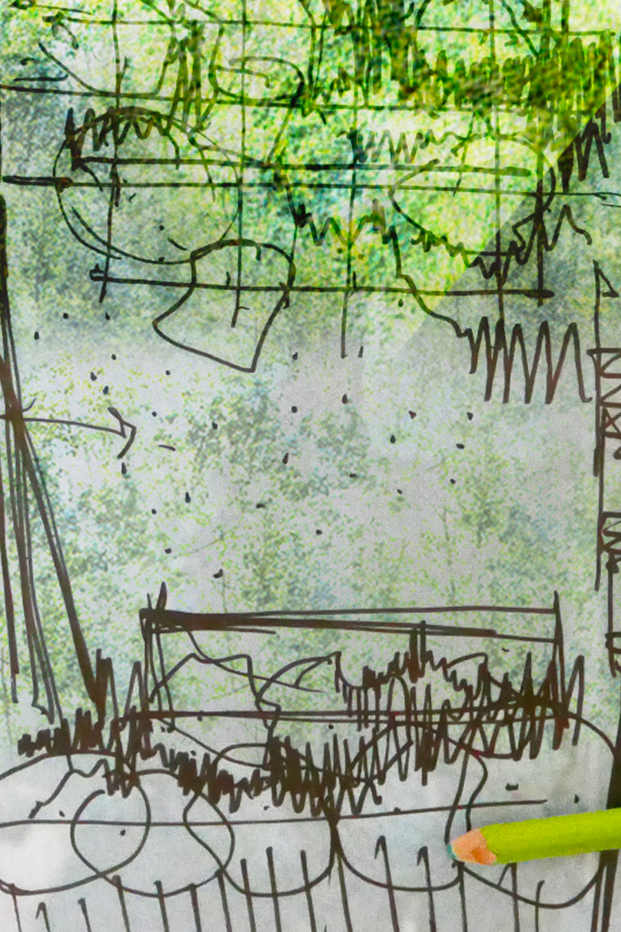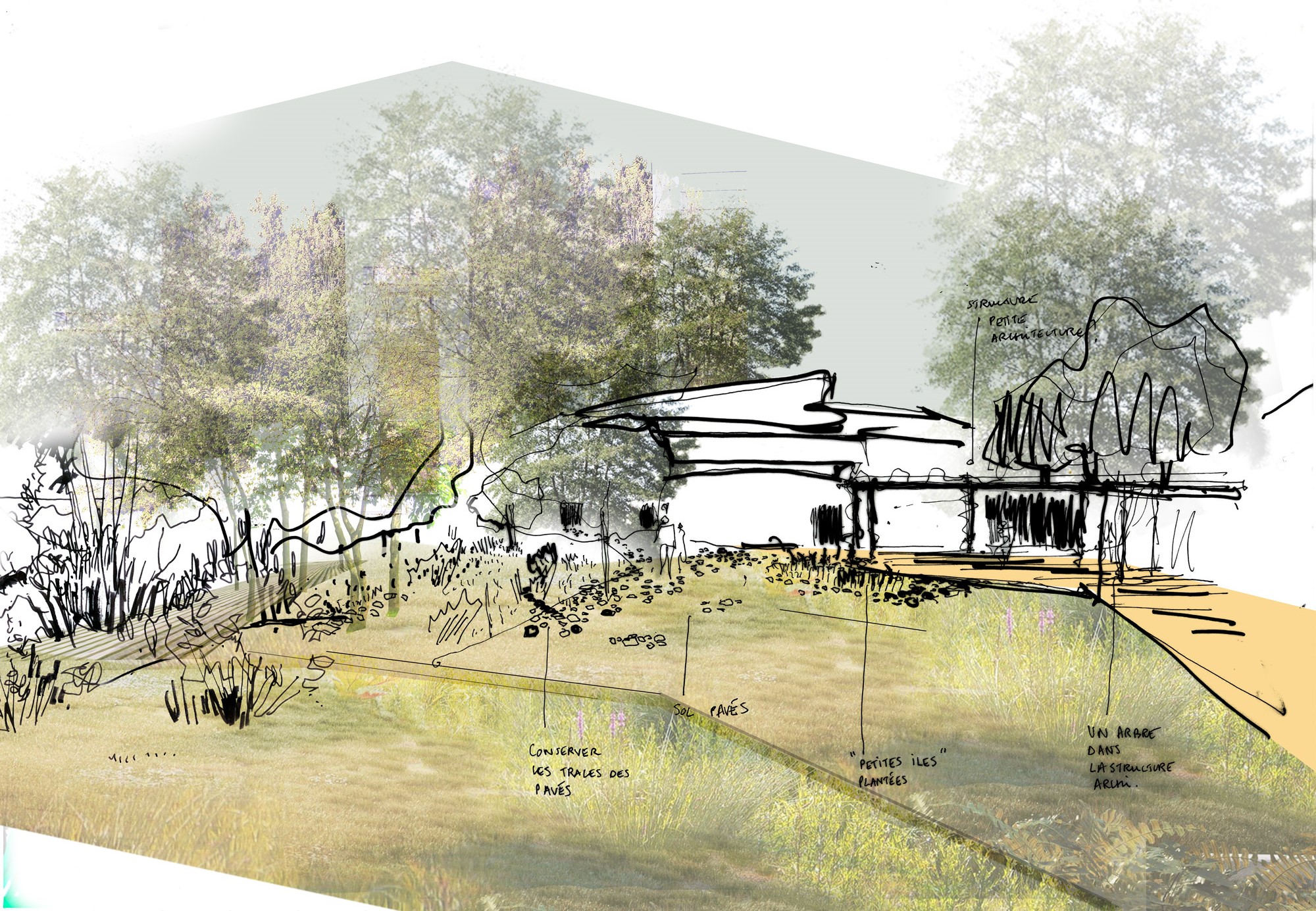 Il s'agit d'un jardin laboratoire : nous avons travaillé avec le potentiel écologique des lieux, pour mettre en place le mode opératoire du projet. Trois dispositifs se sont révélés : Préserver, amender et reconstituer. La figure du jardin se dessine à partir des horizons vers le bois, des sols existants (de leur capacité écologique), et des accès.