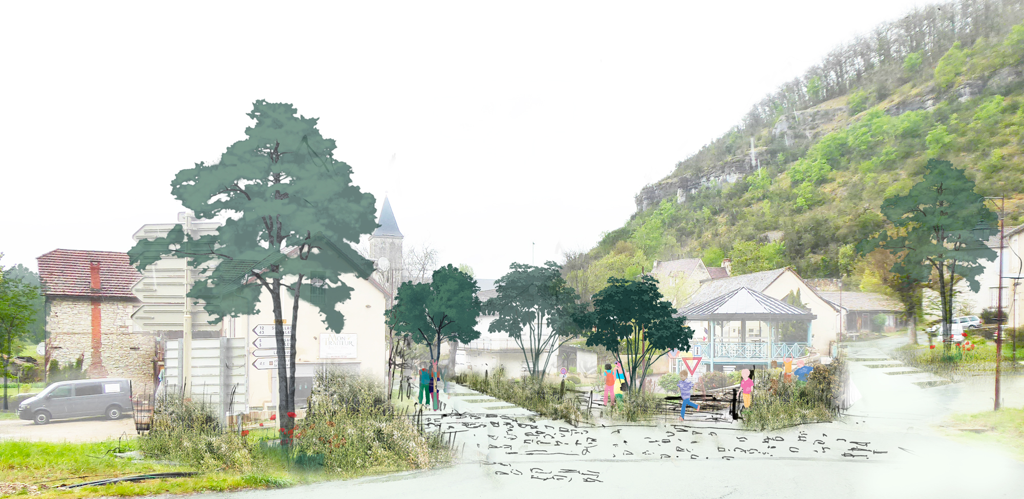 À l’échelle de la commune, on retrouve une grande partie des paysages caractéristiques de la Dordogne caussenarde. Pour cette étude urbaine, le projet de paysage s'empare de la situation topographique existante en terrasse de la commune, pour valoriser ces paysages et les mettre au service des usages, des événements quotidiens et plus exceptionnels.